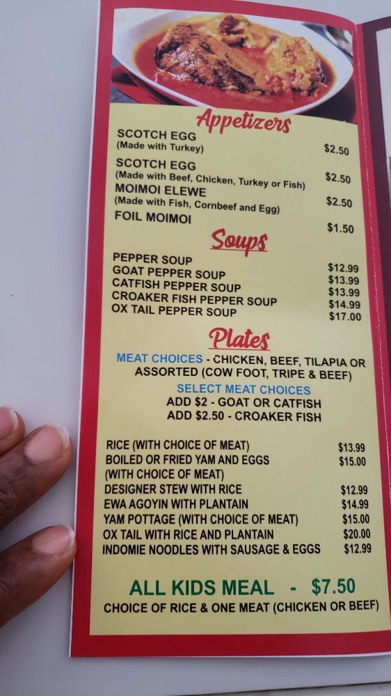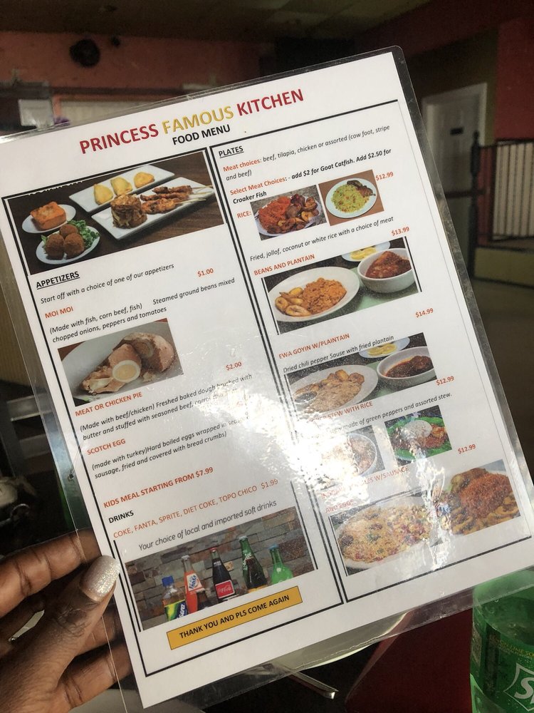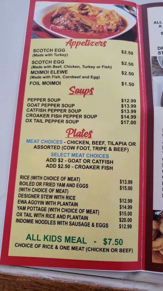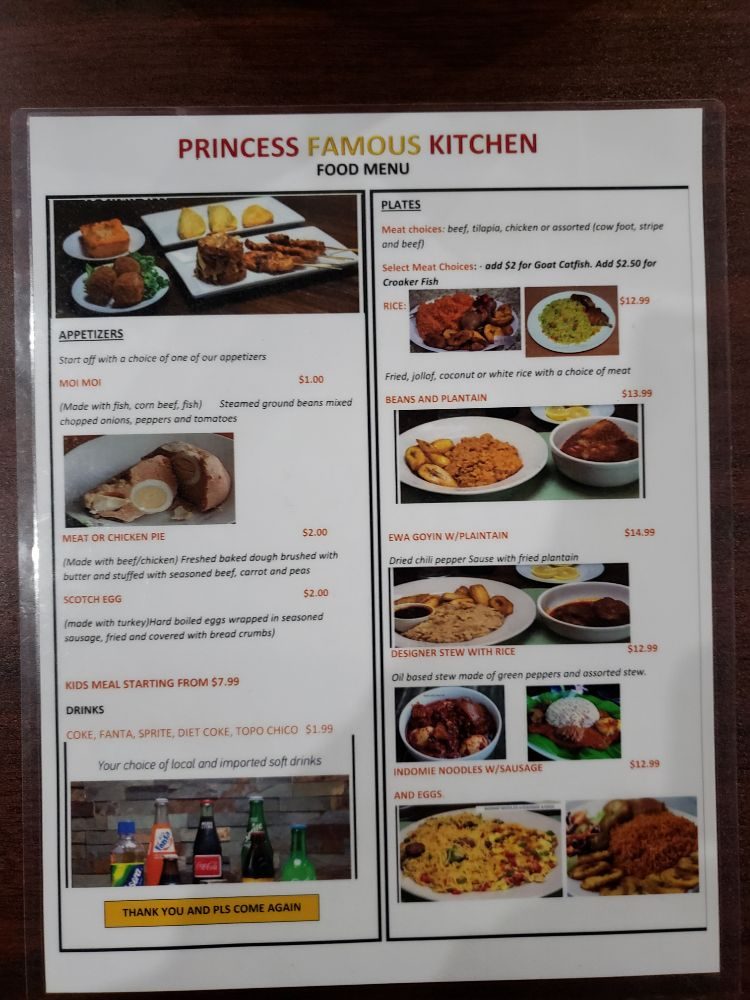 Introducing the menu at Famous Princess Kitchen, located in Houston, TX, is a journey into authentic African cuisine. The restaurant offers a variety of Princess Specials, including Designer Stew, Jollof Rice, and Combination Platters. Their beverages range from Tropical Palm to Malta drinks. Princess Specials 2 feature Gbegiri and Ewedu Abula, Traditional Vegetable Soup, and Bitter Leaf Soup. Customer reviews praise the flavorful dishes and freshly made food. The atmosphere is authentic and the service, though sometimes slow, adds to the experience. Famous Princess Kitchen is a must-visit for those craving traditional African flavors in a welcoming setting.
